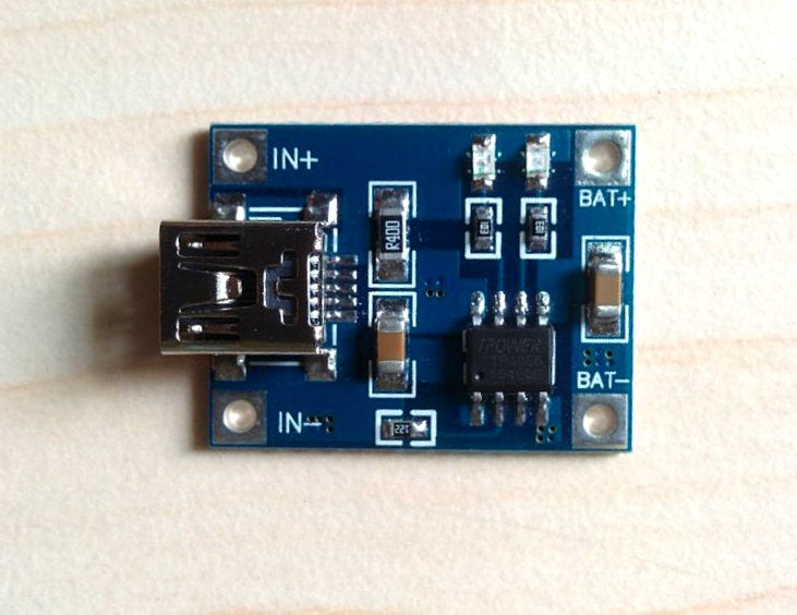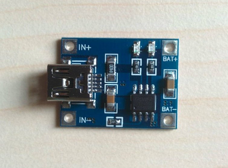 The charger is made by using a most popular IC TP4056.The TP4056 IC is a complete constant current/constant-voltage linear charger for single cell lithium-ion/Lithium Polymer (LiIon/LiPo) batteries. Its SOP-8 package and low external component count make the TP4056 ideally suited for portable applications.If you scare about the SMD soldering,don’t worry.We are so lucky that ready to use TP4056 modules are easily available on eBay with very low price.TP4056 can work within USB and wall adapter. Other features include current monitor,under voltage lockout, automatic recharge, and two status pin to indicate charge termination and the presence of an input voltage.